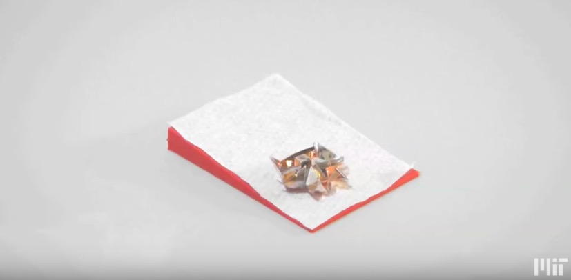在非模拟胃部的环境,折纸机器人的技能可不少。尽管总共才1厘米长,重0.33g,它却能“扛”起0.6g的“重物”。
