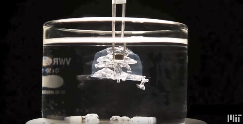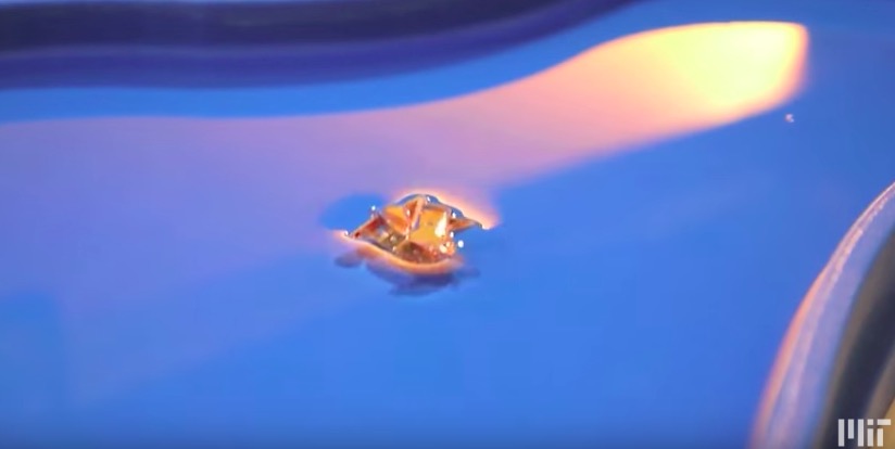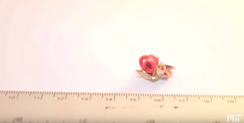 新型机器人由两个结构层夹着热收缩材料制成,干猪肠的中间层受热收缩,由外层窄缝图案决定机器人如何折叠。