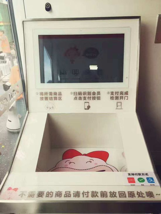 在结算时,顾客将要购买的全部商品放到收银台感应区,显示屏会出现一个二维码,扫描完成,确认购买者的身份后,显示屏上将显示购物的明细和总金额,点击确认支付后,顾客可通过虹支付(虹领巾APP支付)、微信、支付宝三种结算方式买单。顾客拿着已买单的商品走到门口,系统会自动识别是否有未支付的商品,如有未支付商品则会语音提示,并在门口的显示屏上显示未买单的商品,继续完成买单后,系统感应全部买单成功,将会开启大门。若一次性买单完成,系统识别后将自动开启大门。顾客若在过程中遇到问题,还可以一键呼叫在线客服。