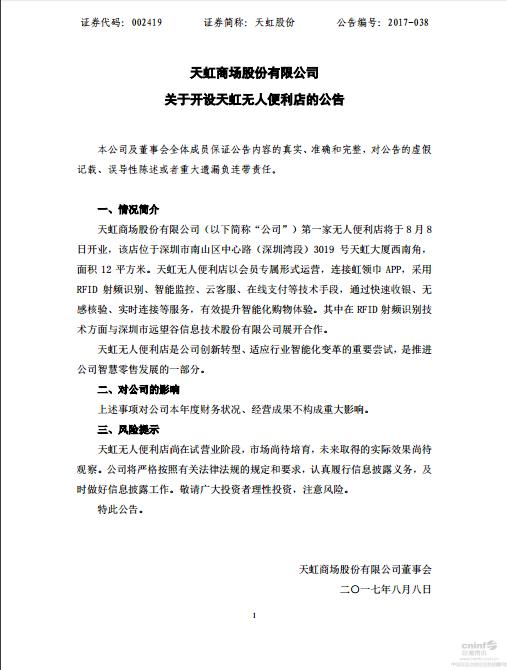 同时,天虹方面还表示,天虹无人便利店尚在试营业阶段,市场尚待培育,未来取得的实际效果尚待观察。