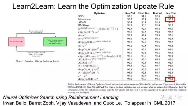 常见的优化方法都是类似的。经常使用的方法包括SGD(随机梯度下降)、Momentum、ADAM、RMSProp等。在这一页可以看到,自动化的方法提出了15种完全不同的表达式,而且表现基本都优于人类设计的优化方法。