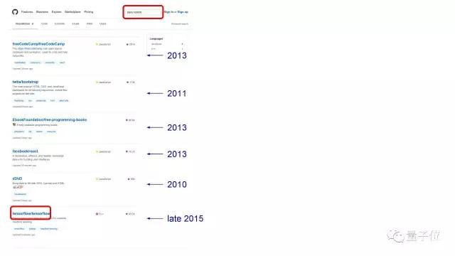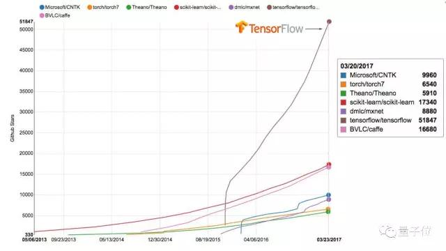 这是GitHub星标数的趋势图,你可以看到TensorFlow与其他机器学习框架的对比。