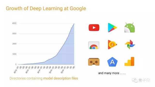 后来,我们把深度学习用到了更多领域,上图左侧是包含我们第一代和第二代(TensorFlow)深度学习框架模型描述文件的程序数量,我们和Google的其他团队合作,把深度学习用到各种产品之中。
