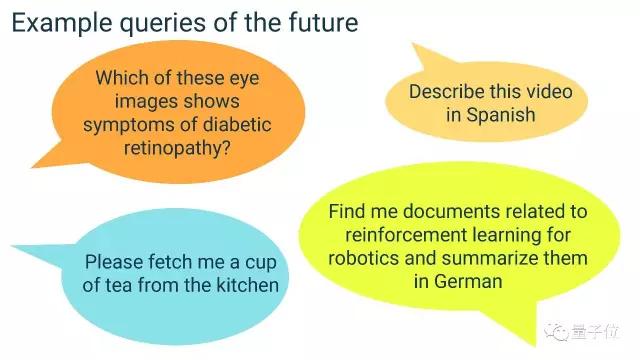 这是一些未来会实现的需求。例如通过图像来发现糖尿病引发的视网膜病变;用西班牙语描述一段视频;让机器人从厨房沏一杯茶来;帮我找到与机器人强化学习有关的文档,并用德语总结出来。