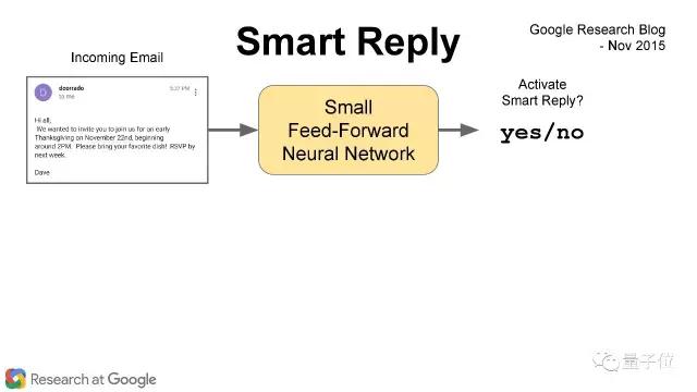 举个例子,这是我发给同事们的一封邮件,问大家要不要参加感恩节聚会。这种邮件只需要简短的回复,有了Smart Reply用户只需要选择“是”或者“否”。