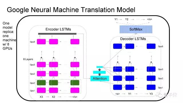这是我们模型的结构,它包含很深的LSTM stack,每一层运行在不同的GPU上;还有一个注意力模块,追踪所有的状态,决定在生成输出序列的各部分时,分别该注意输入数据中的哪一部分。