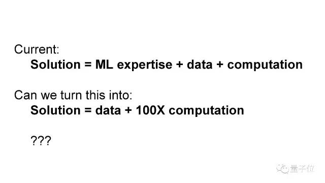 我们研究的解决方案,是数据+100倍的计算力,这中间不需要人类机器学习专家。如果能做到这一点,世界上会有更多的组织和数据能受益于机器学习。