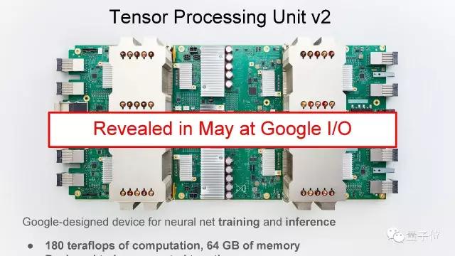 这是我们一直在搞的定制化机器学习加速器(TPU),目标是加速推理以及训练,这个硬件的第一代版本已经在我们的数据中心部署了两年半,在五月的Google I/O大会上,我们展示了第二代TPU。