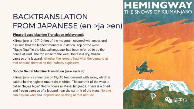这是一位日本教授把海明威《乞力马扎罗的雪》第一段从英语翻译成日语、再从日语翻译回来的结果。上边是基于短语的统计模型的结果,下边是神经网络模型的结果。