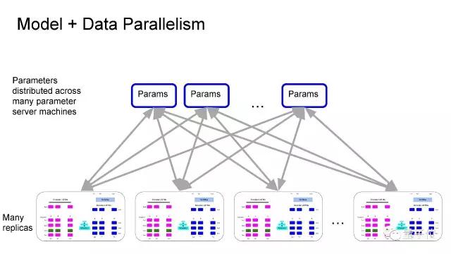 每一份这个模型都运行在一台GPU机器上。我们把这个模型复制了很多份,在训练数据上进行平行训练,然后共享学到的参数。