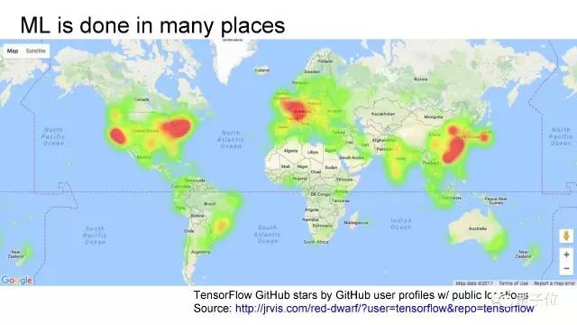 这是世界上为TensorFlow标星的人口分布,全世界几乎都在用机器学习。