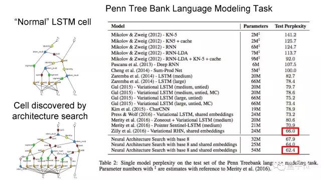 我们还在Penn Treebank数据集上,尝试了一个语言建模任务。我们只是给了架构搜索一个LSTM cell,然后让它寻找处理顺序数据的方法。在这个案例中,架构搜索的方法比此前最先进的方法表现更好。