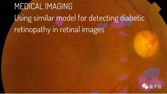 具体来说,是用在眼科检查上。我们让算法从上图这样的视网膜图片上,分辨出是否有糖尿病视网膜病变。