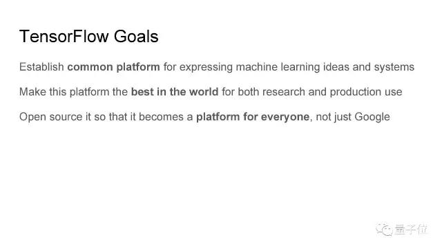 TensorFlow的目标是,建立一个呈现机器学习创意和系统的通用平台,并让这个平台在研究和生产环境中都成为世界最佳,再通过开源,让它成为所有人的平台,而不只是Google的。