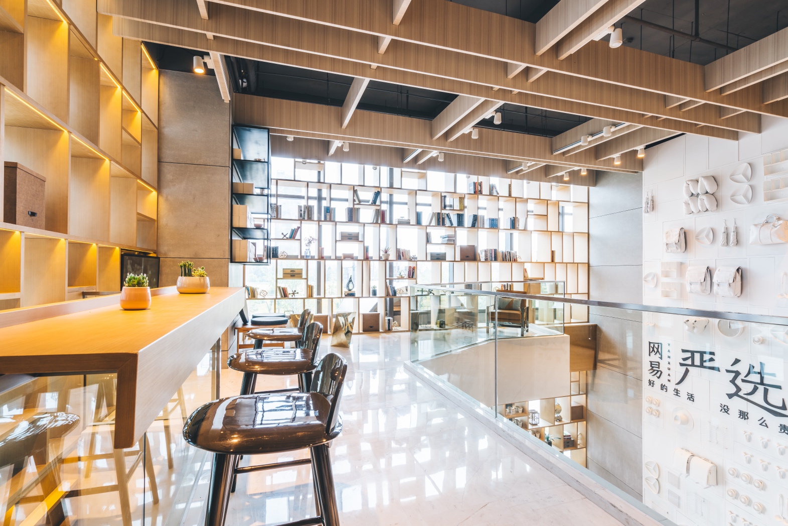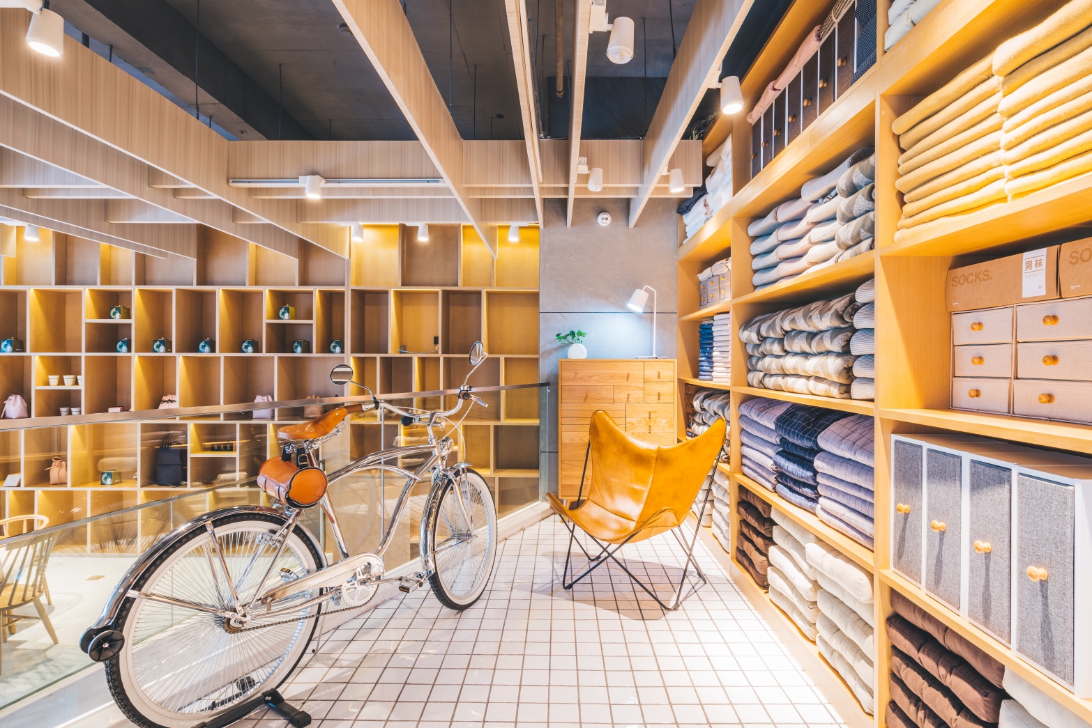 坐着喝茶时,无论正着还是侧着都能看到商品