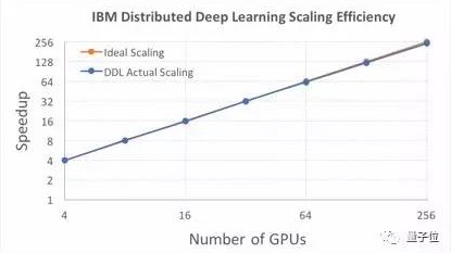 如果利用ResNet-50模型以及与Facebook同样的数据集,IBM研究院的DDL软件基于Caffe软件能实现95%的效率,如下图所示。这一结果利用了由64个Minsky Power S822LC系统组成的集群,每个系统中包含4个英伟达P100 GPU。