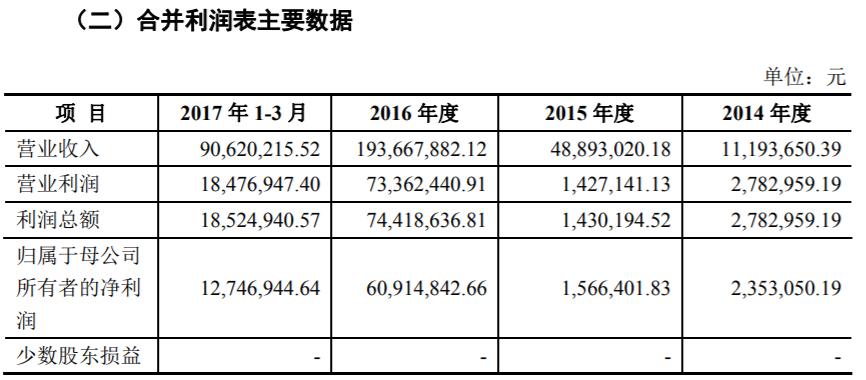 根据招股书,公司2014年营业收入1120万、2015年营收4889万、2016年营收1.93亿,今年第一季度营收9000万;净利润依次为235万、156万、6090万、1270万元。2014 年度至 2016 年度,公司业绩增长非常迅猛,营业收入复合增长率达 315.95%,净利润复合增长率达 408.80%。公司业绩增长主要是由于 2014 年 8 月公司推出消除类游戏《宾果消消消》,用户觉得好玩,公司推广也不错。