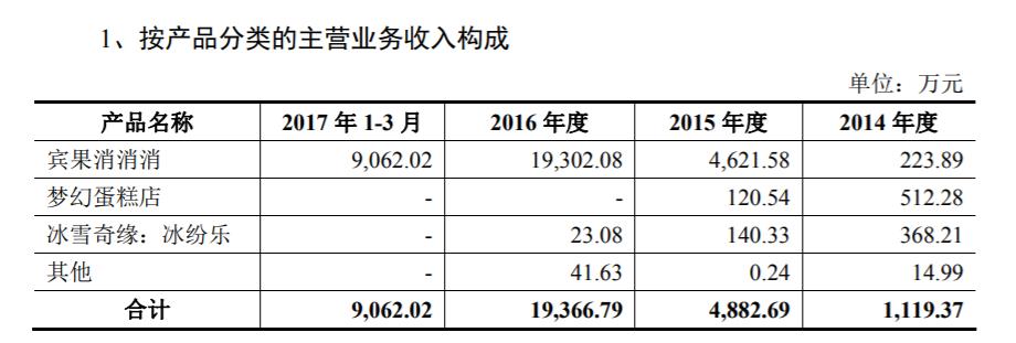 然而,成也消消消,败也消消消。公司最大的问题是,莫过于收入太依赖单一产品。报告期内,公司营业收入主要来源于《宾果消消消》一款游戏产品,2014 年度、2015 年度、2016 年度及 2017 年 1-3 月,该款游戏收入占当期营业收入的 比重分别为 20.00%、94.65%、99.67%和 100.00%。