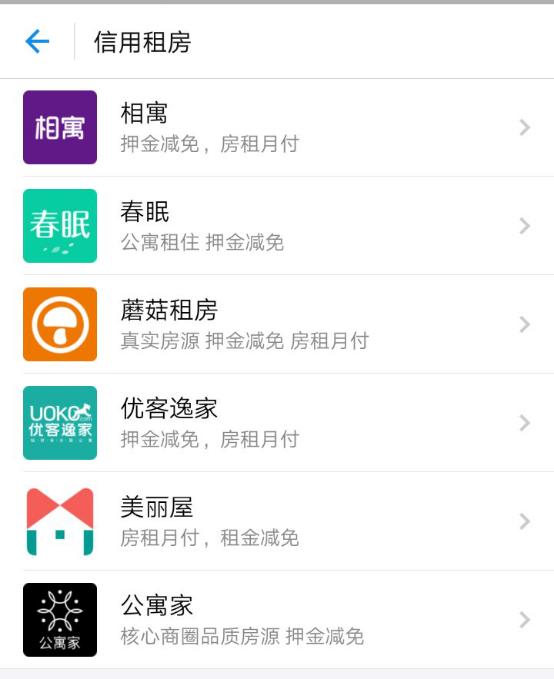 36氪查阅支付宝——芝麻信用发现,其免押金的活动已与多品牌合作。在租房领域,与相寓、蘑菇租房、美丽屋、公寓家、春眠、优客逸家开展了押金减免、房租月付或租金减免等合作。此外,还与途家、未来酒店、小猪短租、木鸟短租等民宿酒店品牌,开展了免押金、免排队等合作。