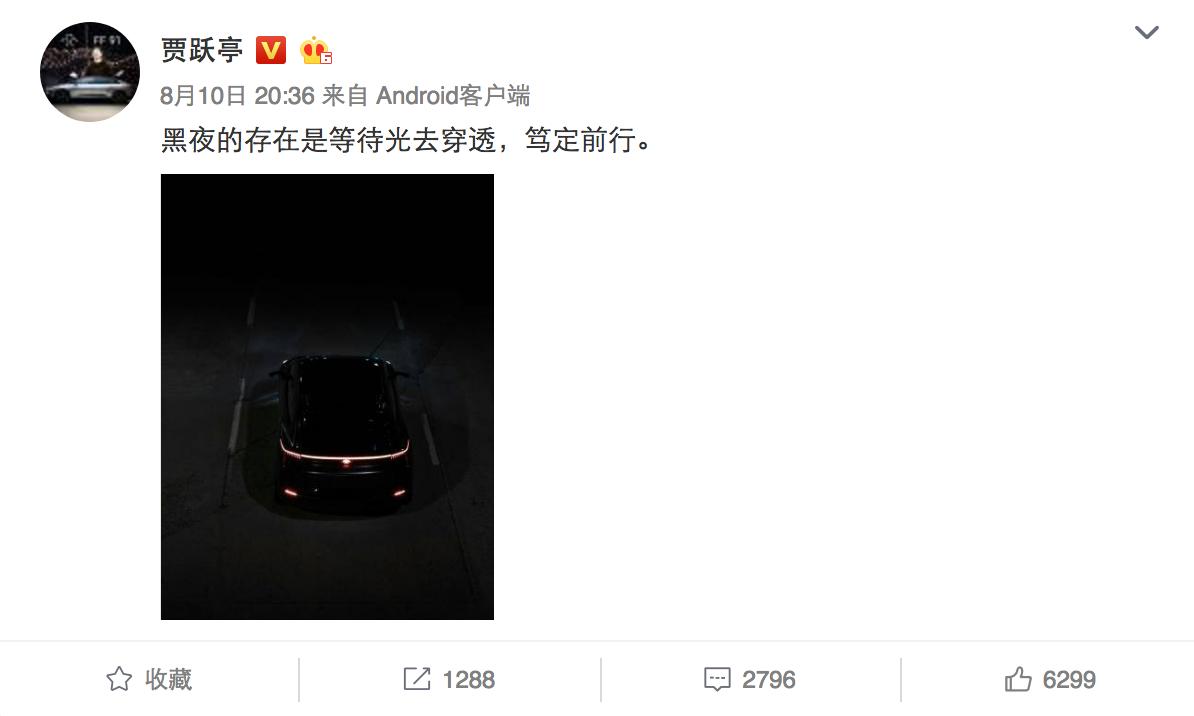 针对上述传闻,8月7日贾跃亭在个人微信公众号、今日头条微头条以及微博个人账号三大平台发声,声明自己没有消失,并发了一大批法拉第未来新工厂的谍照。随后两天,贾跃亭的个人微博都有更新,最后一条为8月10日发布的“黑夜的存在是等待光去穿透,笃定前行。”