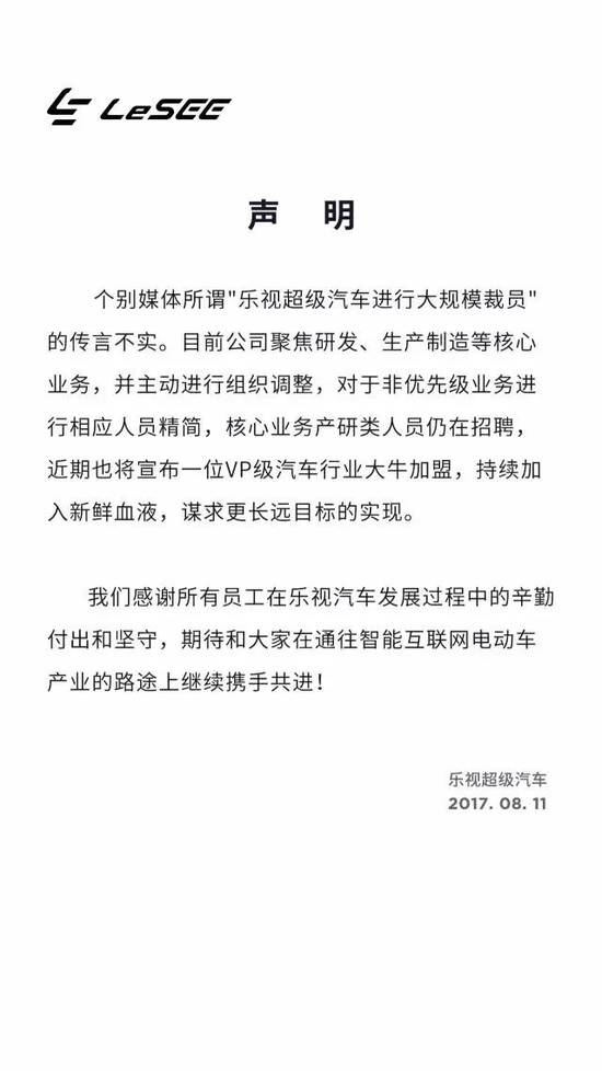 乐视超级汽车表示,目前公司聚焦研发、生产制造等核心业务,并主动进行组织调整,对于非优先级业务进行相应人员精简,核心业务产研类人员仍在招聘,近期也将宣布一位VP级汽车行业大牛加盟。