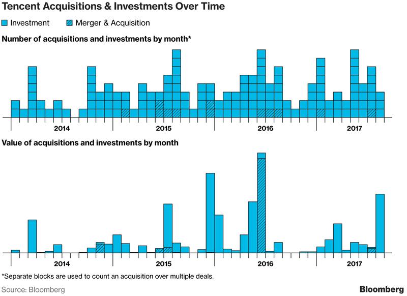 2016年和2017年里,阿里和腾讯已经宣布或完成的投资收购交易规模达到550亿美元。这一数字起初让投资人也感到震惊,因为多年以来他们都持有很少的一部分股份。两家公司这样做的动力源于要保持领先的地位:正如Alphabet 的董事长Eric Schmidt所言,在互联网行业竞争对手可能会因为一次点击而消失。