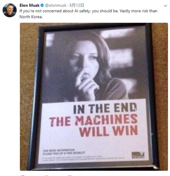 8月14日消息,据Futurism报道,科技大亨伊隆·马斯克(Elon Musk)不久前在推特上发布了一张照片,引发人们对人工智能(AI)安全性的争论。当时马斯克发布了有关赌博上瘾广告的图片,上面写着“最终机器会赢”,显然他不仅仅指赌博机。更重要的是,马斯克称AI带来的危险比朝鲜核武器更大。