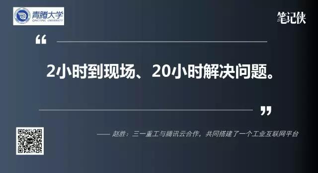 三一重工与腾讯云合作,共同搭建了一个工业互联网平台。在此平台上,把全球超过30万台重型机械设备,联网连接起来,实时采集超过1万个参数,“这样可以令任何地点的设备出故障时,都可以立刻感知,2小时到现场、20小时解决问题。”