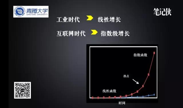 工业时代的增长是线性的,互联网时代是指数级的。哈佛商学院在教战略领导力营销,斯坦福教三门课,指数级增长、设计思维和精益创业。