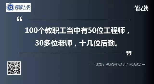 第一,100个教职工当中有50位工程师,30多位老师,十几位后勤,工程师在里面占一半。中国100个教职工80多位都是老师。