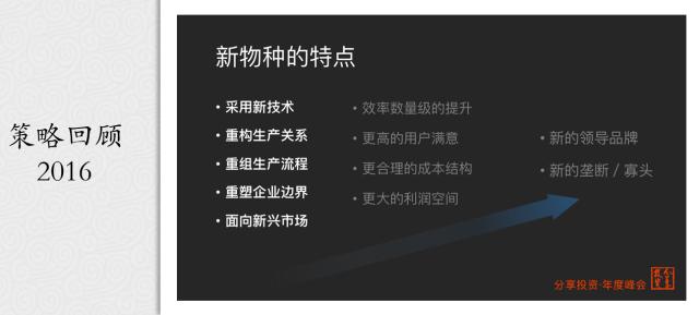 接着,在2016年分享投资的年会上,我给大家讲了一个名词:“新物种”。在互联网技术环境下,这些创新者、创业者面对新兴的市场、新的消费群体,采用新的技术重塑他的企业边界、重构生产关系、再造生产流程……通过这些创新路径满足新的需求,诞生出新的领导品牌。这些企业我们把它称之为“新物种”。在这个领域我们互联创新基金的第二期也取得了很好的收获。
