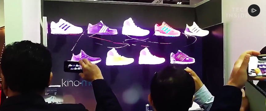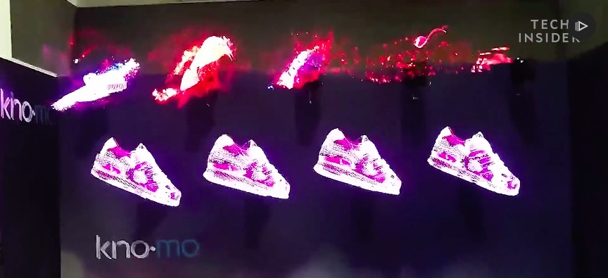 最新的广告方式就用到了全息技术。你面前原本空无一物,然后一双双炫彩的鞋浮现,它们展示的全息动画,在空中上演鞋的律动、旋转、变幻……