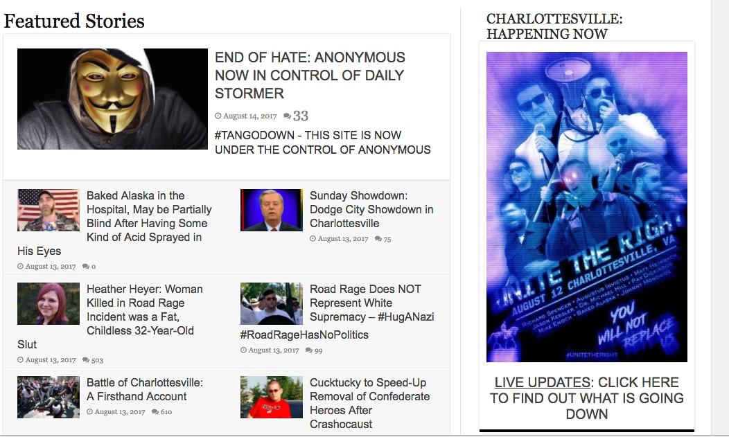 网站托管公司GoDaddy首先采取了行动。他们周日表示,在发表诋毁Heyer的文章之后,他们已经让“Daily Stormer”在24小时迁走域名。今天,匿名者黑客组织则采取了更强力的行动,直接将网站给黑掉。