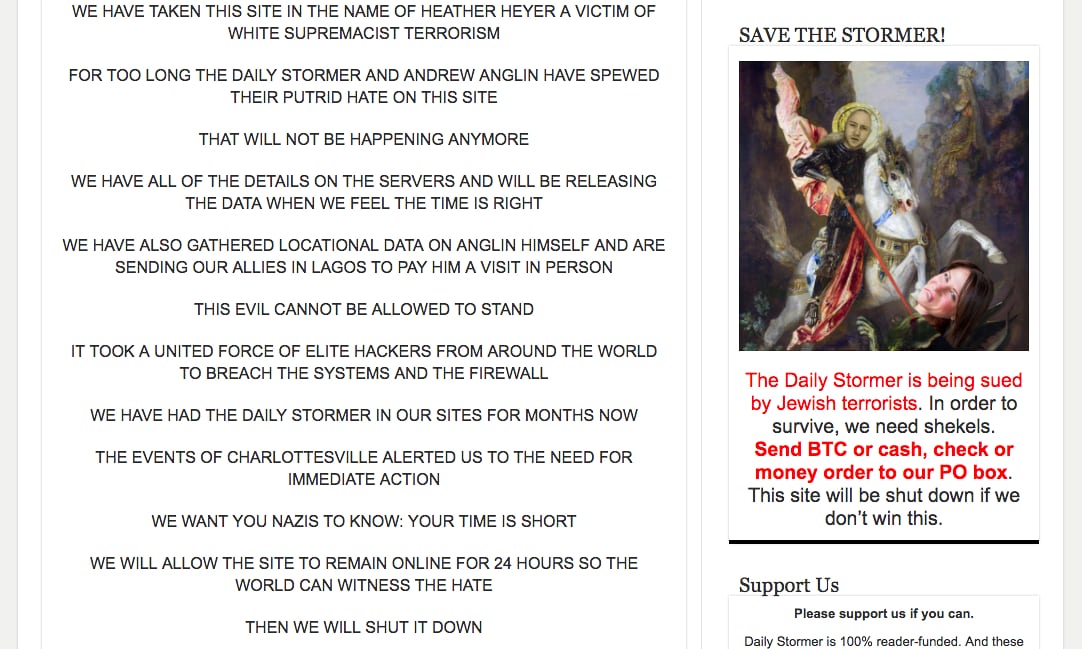 匿名者在留言中称,他们将该网站改为以Heyer的名字命名,称她是“白人至上主义和恐怖主义的受害者”。匿名者表示,Daily Stormer这样的网站已经在网上散播毒药太久了,这种罪恶让人无法忍受,因此,来自世界各地的精英黑客团结一致,攻克了Daily Stormer的防火墙。