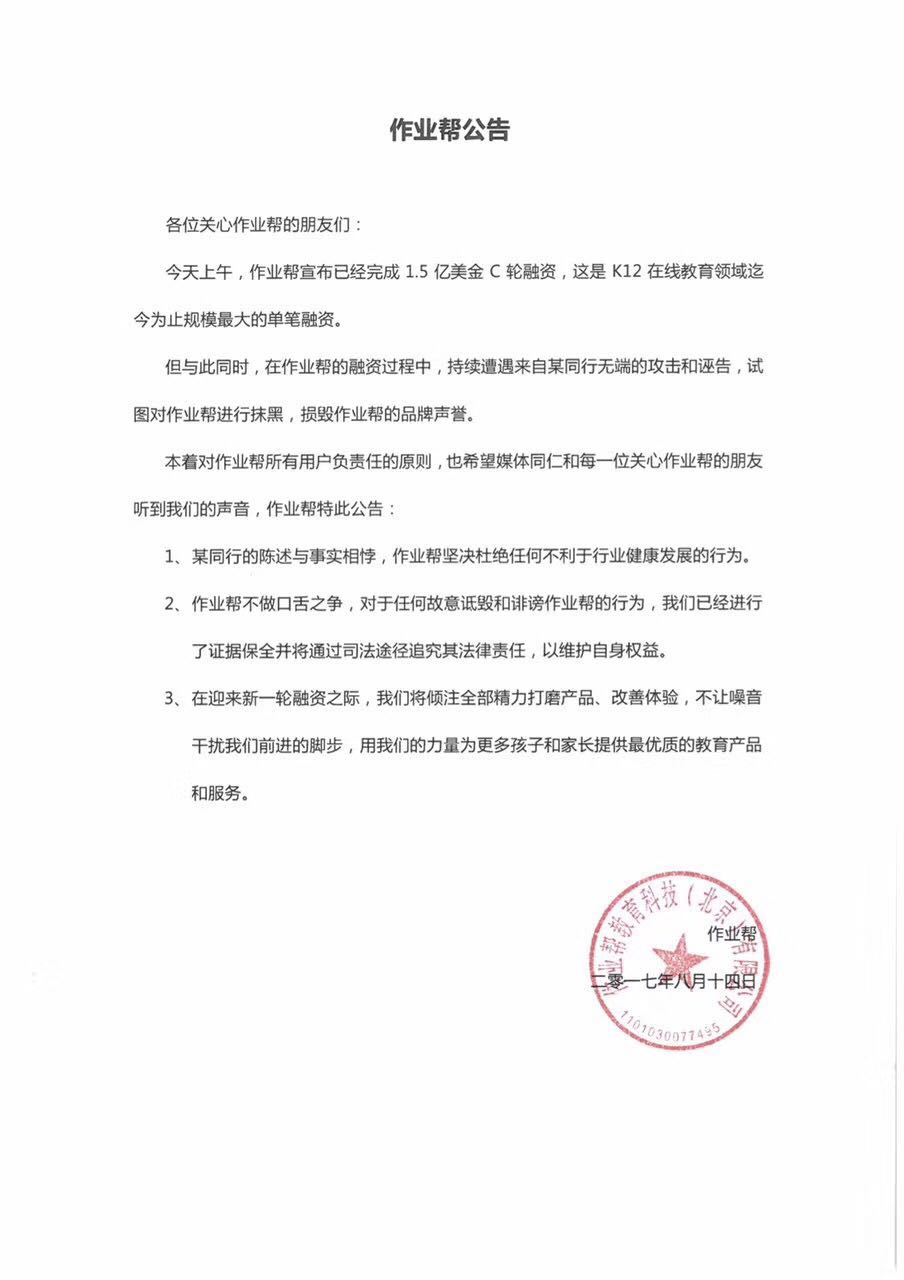今日晚间,作业帮发布公告,称“某同行的陈述与事实相悖,作业帮持续遭到来自同行的无端攻击和诬告,作业帮坚决杜绝任何不利于行业健康发展的行为。”并表示,“在迎来新一轮融资之际,我们将倾注全部精力打磨产品,改善体验,不让噪音干扰我们前进的步伐。”
