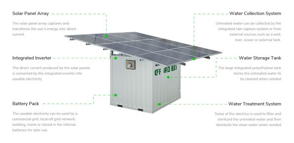 Cecchini表示,容器内部是一个5级微型过滤器,能够将污水转化为无味、透明、无菌的可饮用水。一个四口之家只需要支付12美分(100卢旺达法郎),就能满足一天的用水需求。同时,每个设备都有充足的太阳能电池板,支持300个家庭的电池组。电力能够供应3个LED灯运行4个小时,以及两部手机的充电。