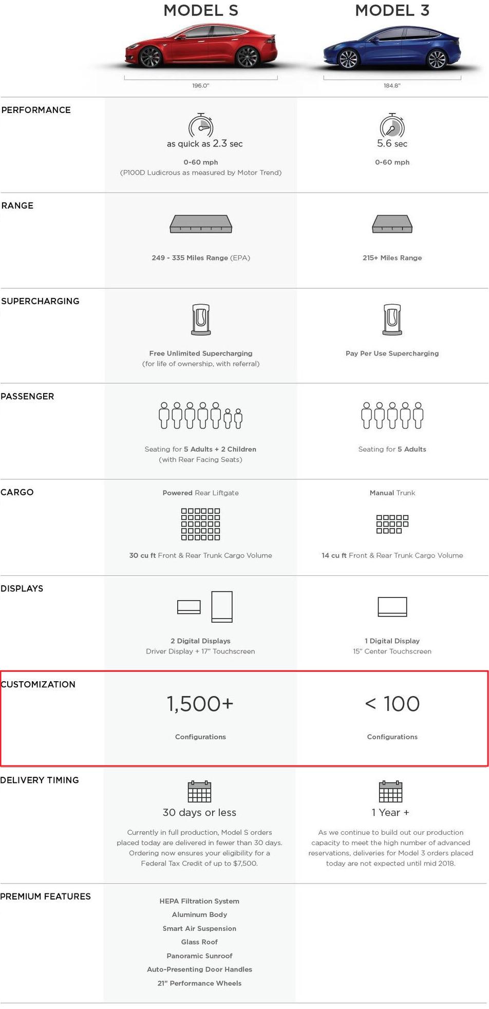 首先是Model 3,这是Model 3交付前特斯拉官方放出的一张Model S和Model 3对比图,图中红框那一栏,Model 3的定制组合数从Model S的1500+变成了<100。特斯拉CEO Elon Musk给出的理由是更少的选配有利于更快的提高产能。再看Model 3的尊享升级套件,正好就有上面把座椅加热和全景天窗捆绑销售的问题:)