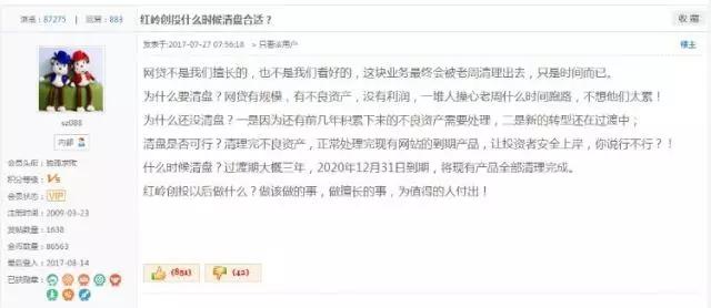 对于平台一些重大的新闻,不论好坏,周世平都会选择最先在红岭社区里发帖公布,试探投资人的反应。比如哪个大标项目“踩雷”了,不良项目的处置进度,以及,这次的清盘计划。