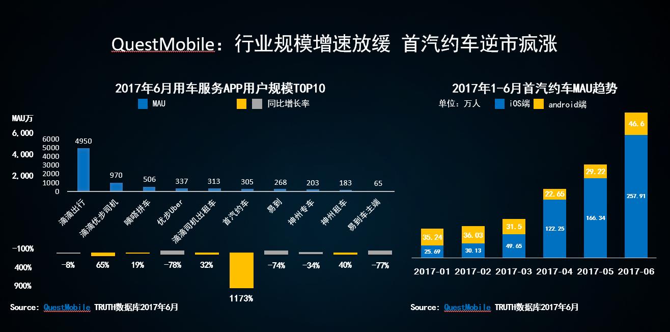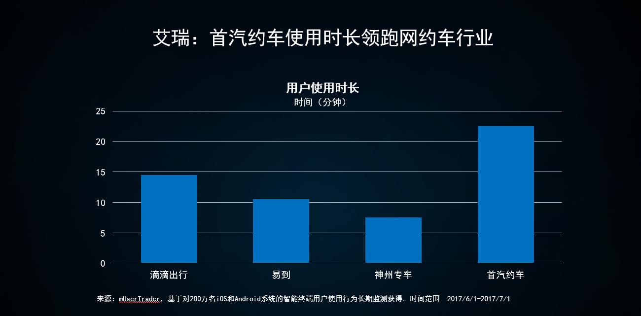 截至目前,首汽约车已经在全国48个城市开通了服务,日订单量达到50万以上,每月活跃用户超过300万。在整个行业规模因为网约车新政的影响而增速放缓的时候,首汽约车则实现逆势增长,据QuestMobile的最新数据显示,2017年6月用车服务App用户规模首汽约车已达305万,同比增长1173%。2017年1-6月,首汽约车的月度活跃用户数也呈几何级数增长,从1月的60余万人到6月的305万人,完成了5倍的增长。艾瑞的最新数据则显示,首汽约车App的用户使用时长也处于领先态势,用户单日使用时长高达近25分钟,行业内其他平台最高不过15分钟。