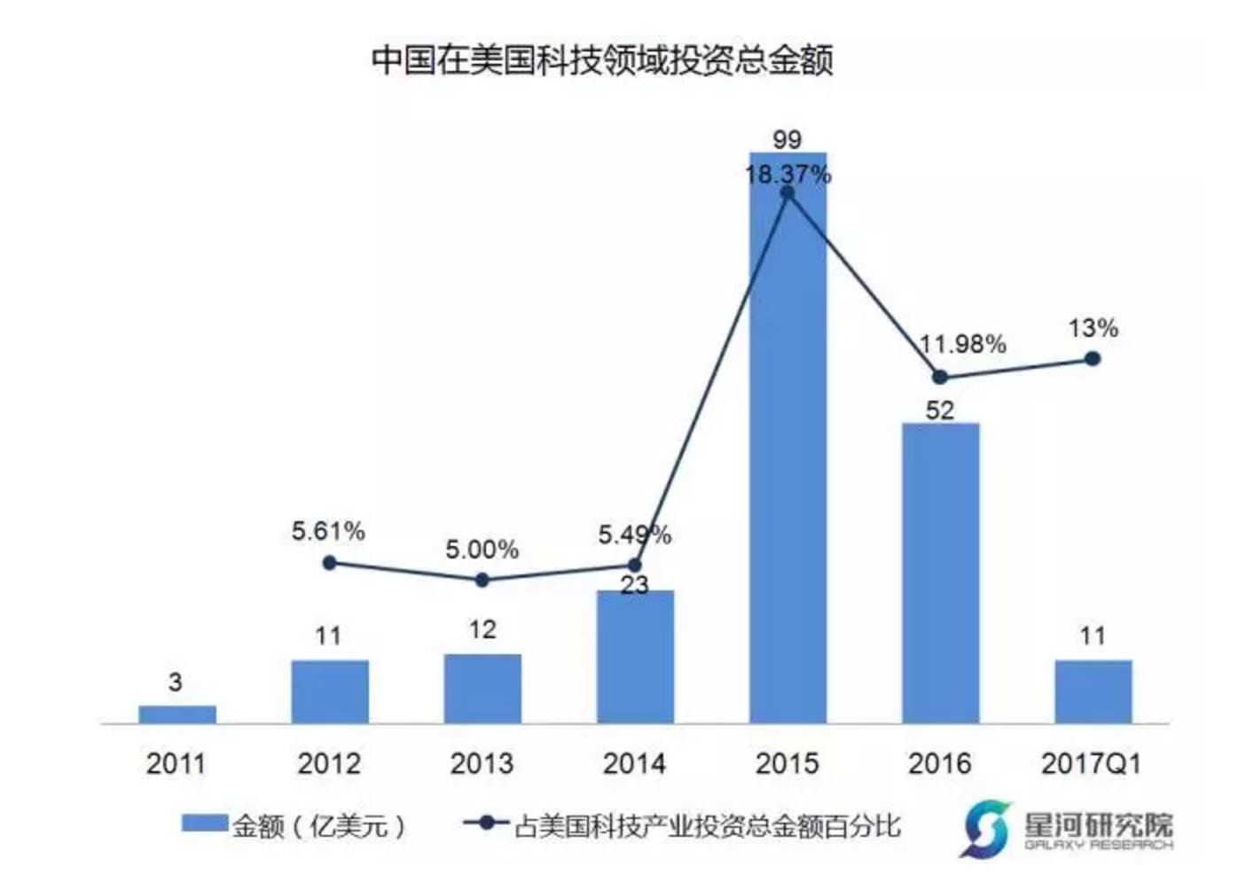 在2016年投资金额虽然有所下降,但仍然是2014年的两倍多。而且中国投资者参与投资的金额也占了美国科技产业整体投资的10%以上,在2015年曾经达到近五分之一。