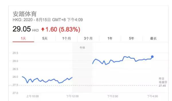 今天(8月15日),安踏股价以28港元开盘,在午后年报发布后一路飙升,最终以29.05元收盘,总市值为779.72亿港币。盘中最高值一度达到29.35港元,折合787.78亿港币的总市值,距离800亿仅一步之遥。