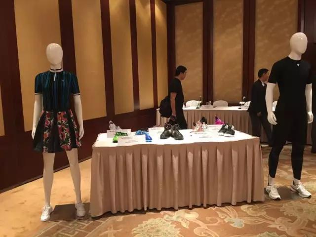 发布会现场一侧展示了安踏的鞋子以及FILA、DESCENT的服装。