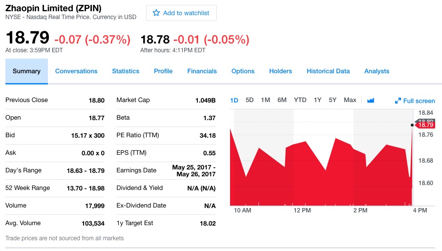 智联招聘周二在纽交所的开盘价为18.77美元。截至周二收盘,智联招聘股价下跌0.07美元,报收于18.79美元,跌幅为0.37%。截至美国东部时间周二16:11分(北京时间周三4:11分),智联招聘股价在盘后交易中下跌0.01美元至18.78美元,跌幅为0.05%。过去52周,智联招聘股价最高为18.98美元,最低为13.70美元。(编译/箫雨)