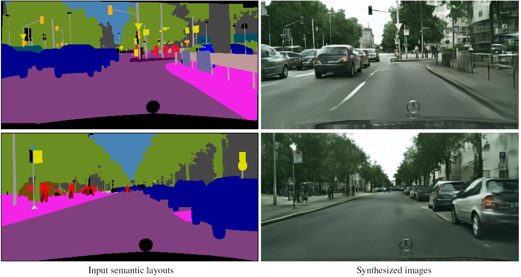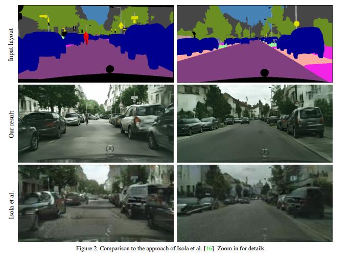 陈启峰的系统首先处理一张它未“见过“的照片,照片上是现实中存在的街道。但是这张照片上做了标记,所以AI知道哪个部分是车,哪个部分是人,哪个部分是路等等。然后AI就用这张图的布局作为一个向导,来生成一张全新的图像。