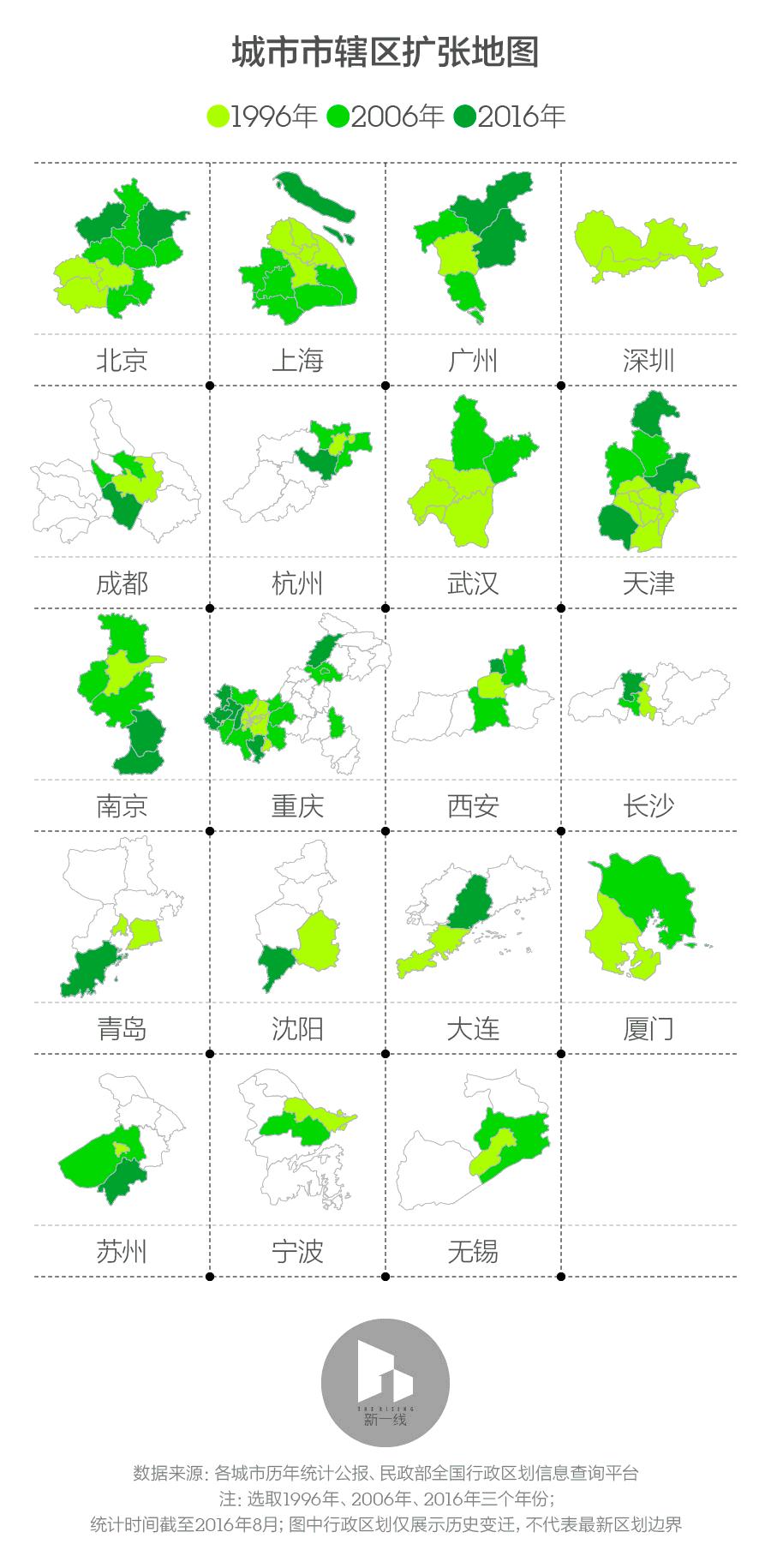 总之,这一轮的城市扩展,表现出的力度前所未有。由于新增城区,都属于传统上的郊区,远离城市中心,面积又远远大于市中心行政区,这使得这些城市发展多了无数的可能。