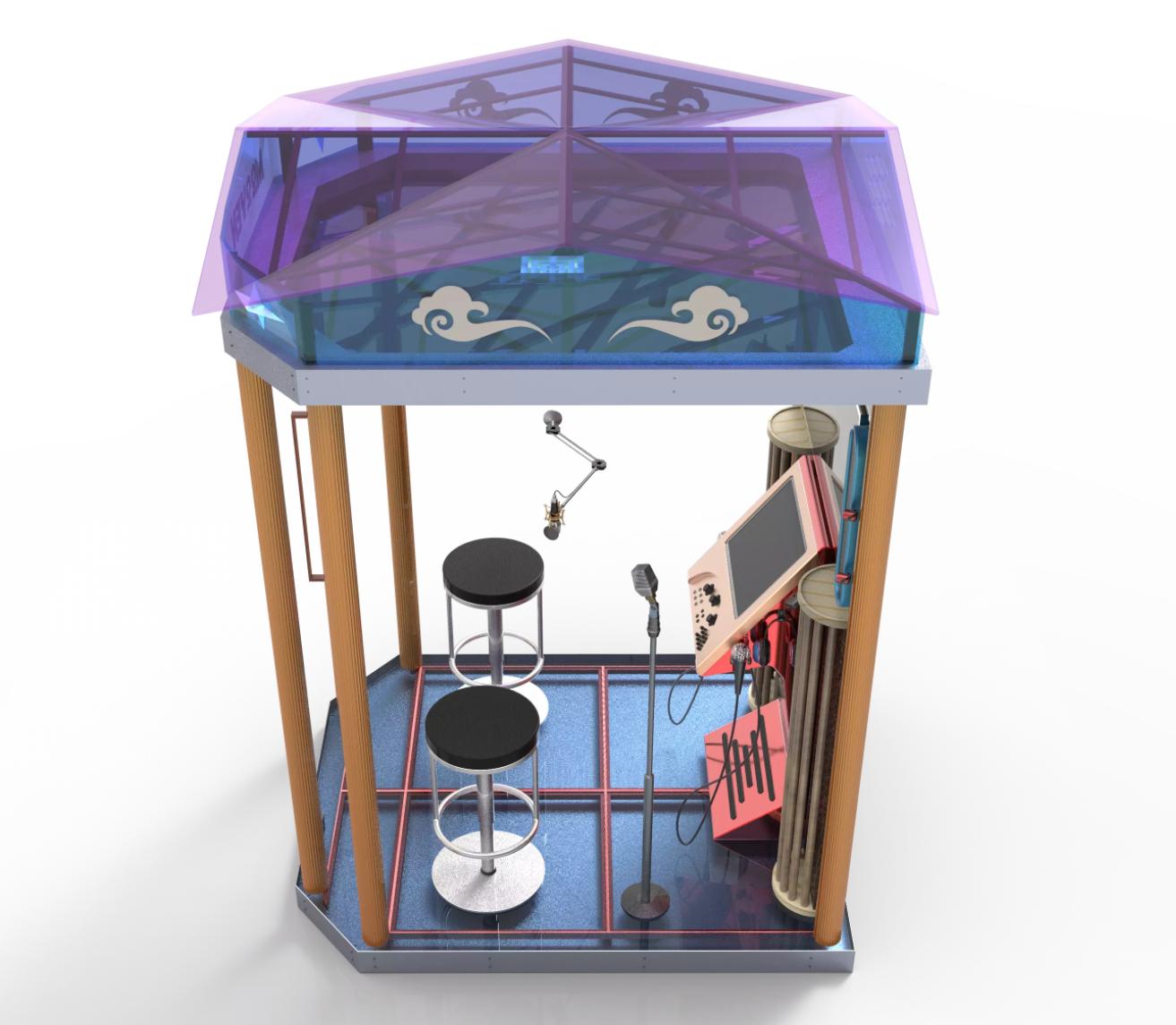 魔云间和其他的迷你KTV设备外形上差不多,都属于盒子状的空间。魔云间的设备的纵深为1.6米*1.9米,主要配有两个到四个座位,一块屏幕,5-8个不同角度的摄像机位和音响设备。如下图所示: