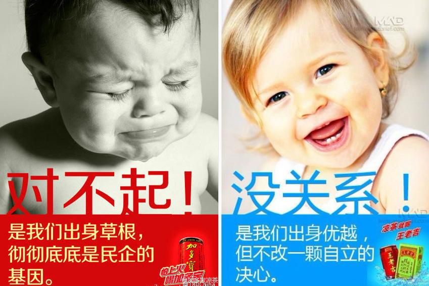 与法律诉讼上的节节败退不同,在广告营销以及大众舆论上,看起来相对弱势的加多宝收获了人们更多的同情,刚好它也善于利用这种情绪。2013年2月,加多宝凉茶的官方微博连续发布了四条以“对不起”开头的语录,通过自嘲的方式控诉广药集团对自己的“压迫”。当然,王老吉随后也以“别装了”开头的文案反呛。但在当时的环境下,不少消费者都选择站在“加多宝”的身后。