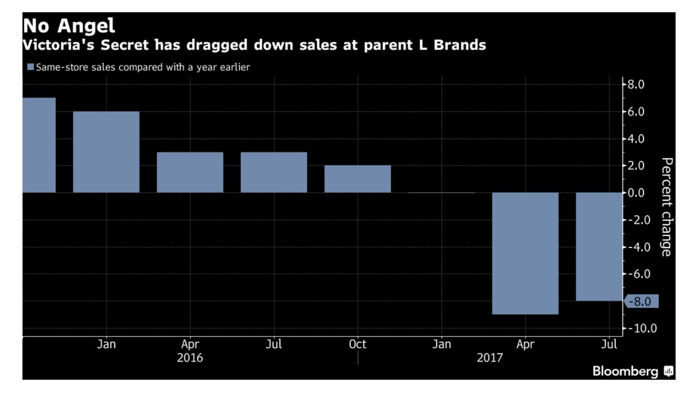 昨日,维密母公司L Brands又交出一份另市场失望的业绩报告,同店销售连续8个月下跌。在截至7月29日的第二季度,公司总销售额下滑了5%至27.55亿美元,可比销售额降了8%,毛利润降了8%,运营利润跌了26%。