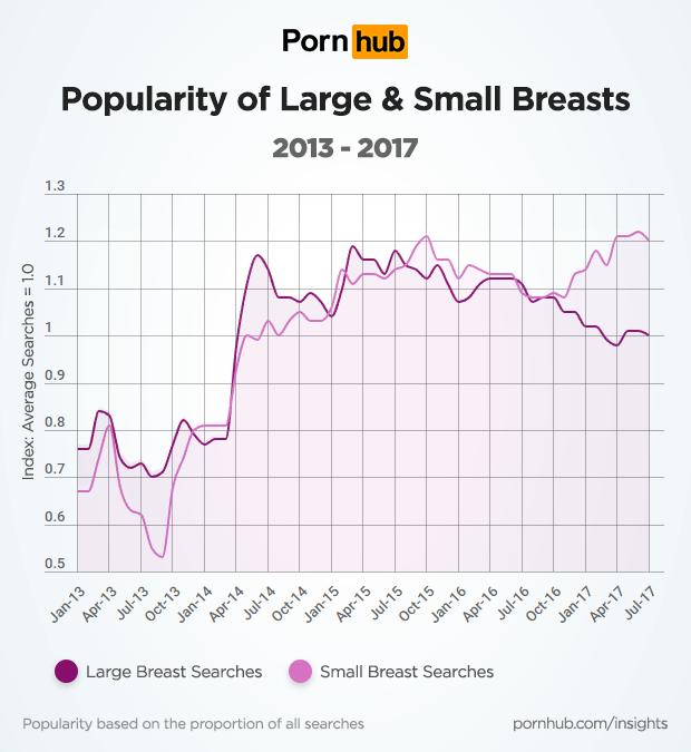全球最大成人网站Pornhub的调查报告显示,搜索“大胸”资源的人群在2014年达到顶峰后,开始下降,反而搜索“小胸”的人更多。搜索“隆胸”的人群也是如此,在2014年之后被“自然胸”赶超了。