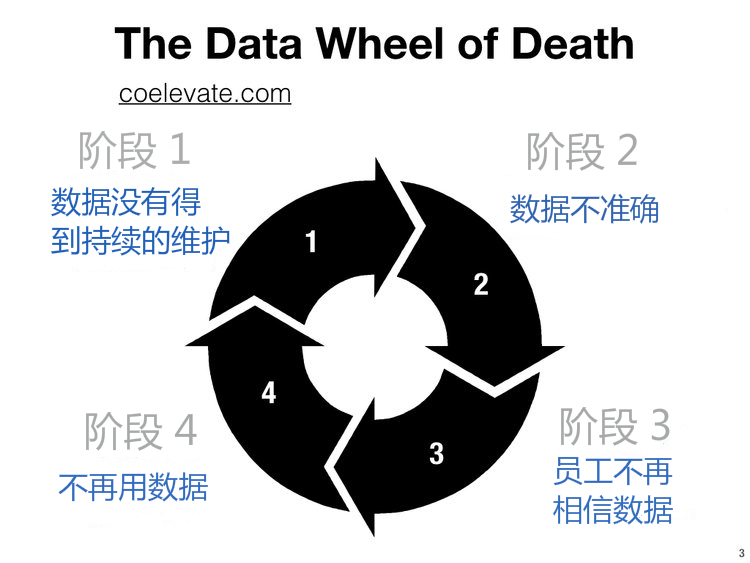 数据不断维护 - >数据变得不准确/有缺陷 - >员工不再相信数据 - >不再使用数据